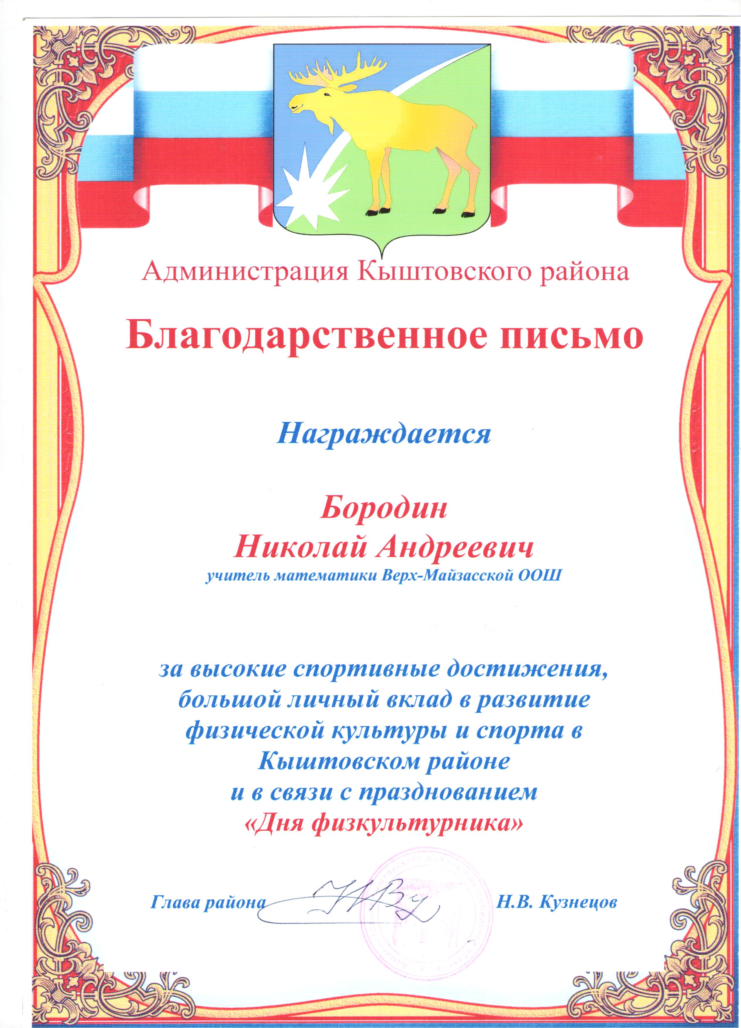 Благодарственное письмо администрации Кыштовского района.
