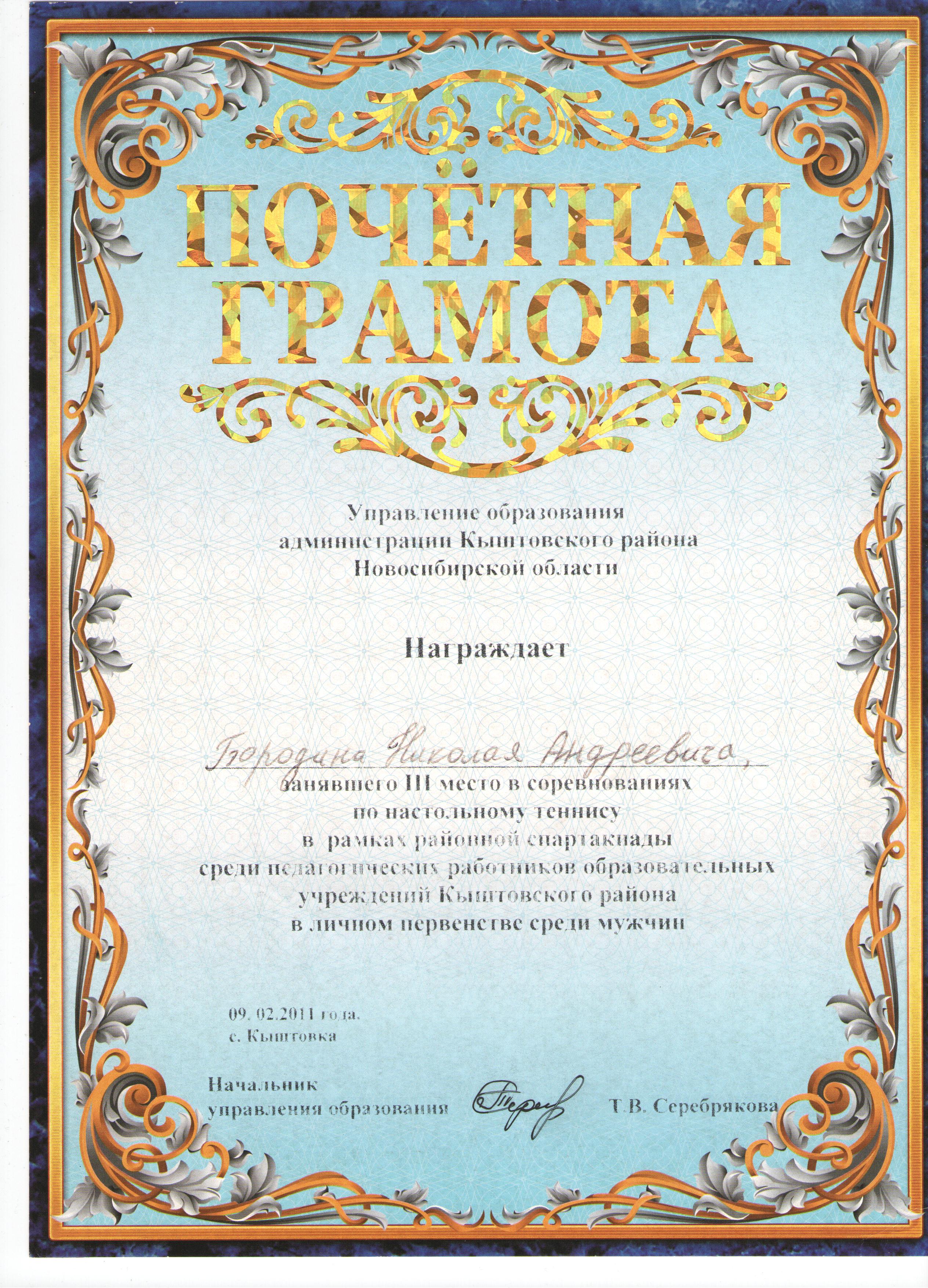 Почетная грамота. Управление образования администрации Кыштовского района Новосибирской области.