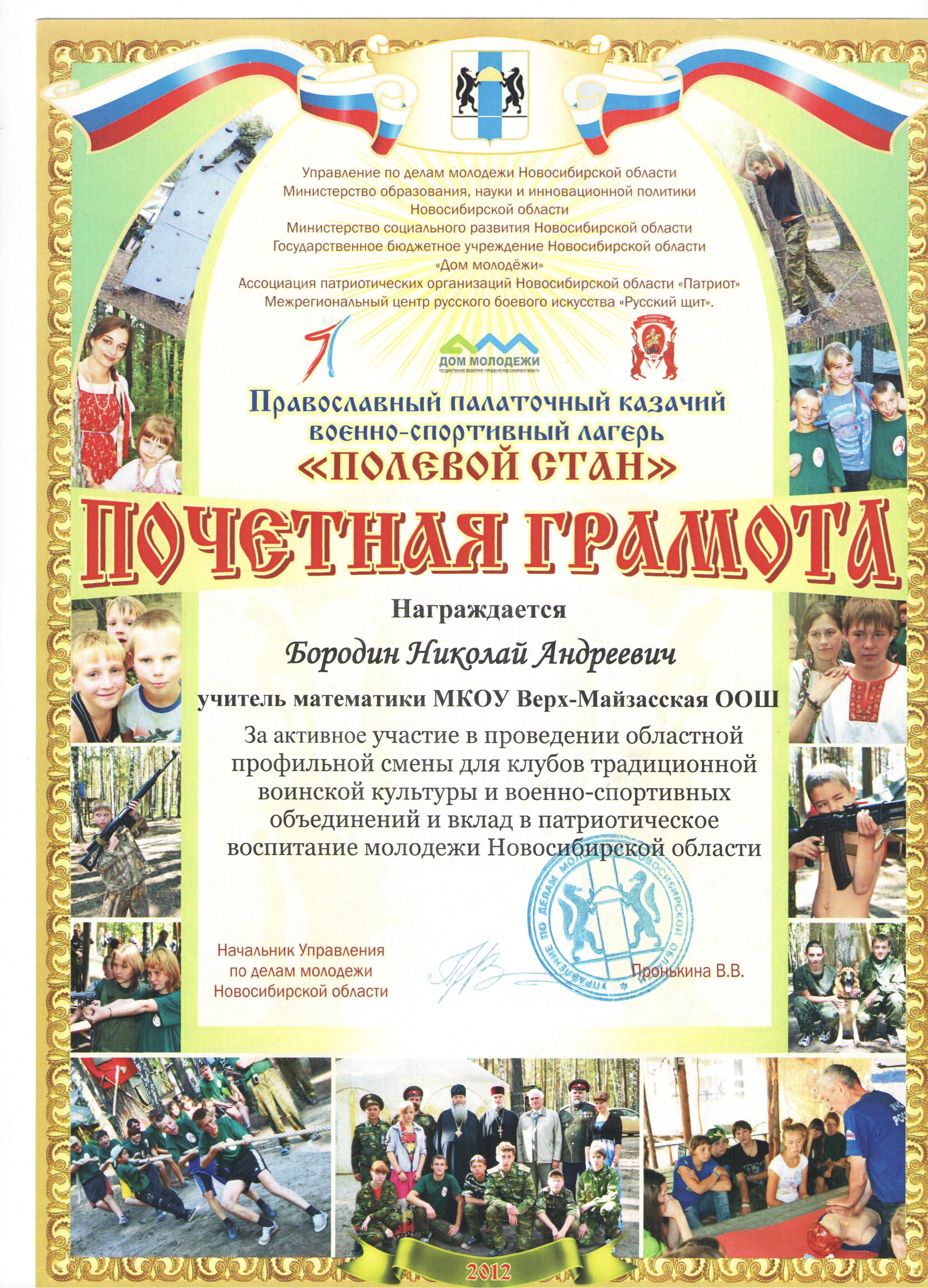 Почетная грамота. Православный палаточный казачий военно-спортивный лагерь "Полевой стан"
